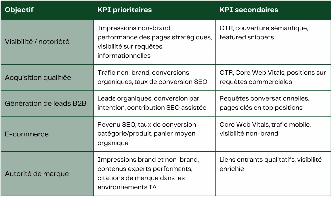 Les KPI SEO les plus importants en 2026 sont généralement :